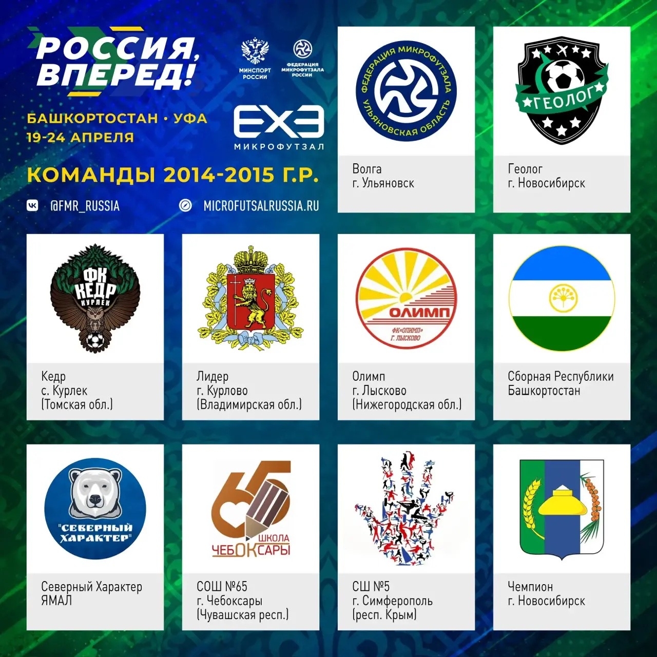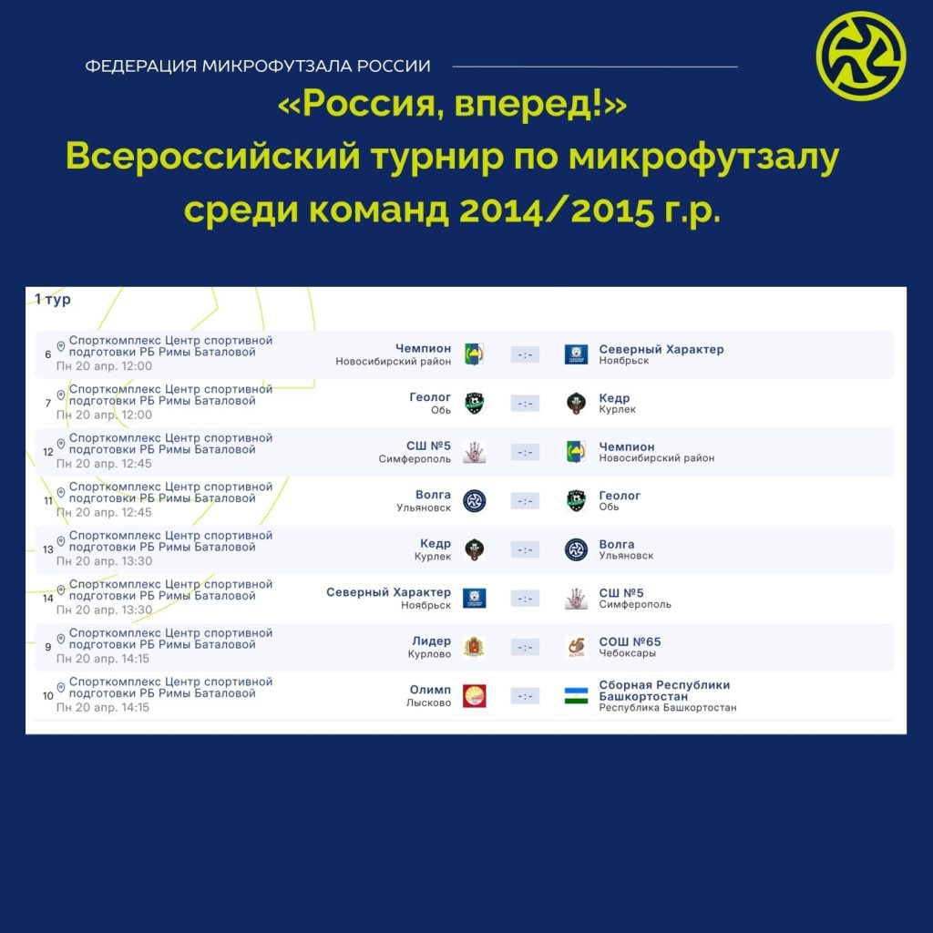 Друзья, у нас важное и волнительное событие! С 19 по 24 апреля в столице Башкортостана – городе Уфа – проходит Всероссийский турнир по микрофутзалу «Россия, вперёд!» среди юношей 2014–2015 г.р. (11–12 лет). В эти дни за главный трофей сразятся 10 сильнейших команд из разных регионов нашей большой страны. И среди них – наша команда «СШ5» под руководством тренера Зиядинова Алима Наримановича! 🔥