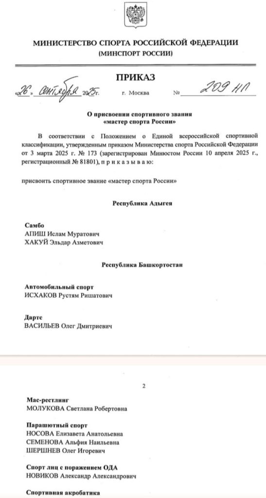 📃 Согласно Приказу Министерства спорта Российской Федерации №209НП от 26.09.2025 г., Мария официально вписала свое имя в историю крымского спорта!